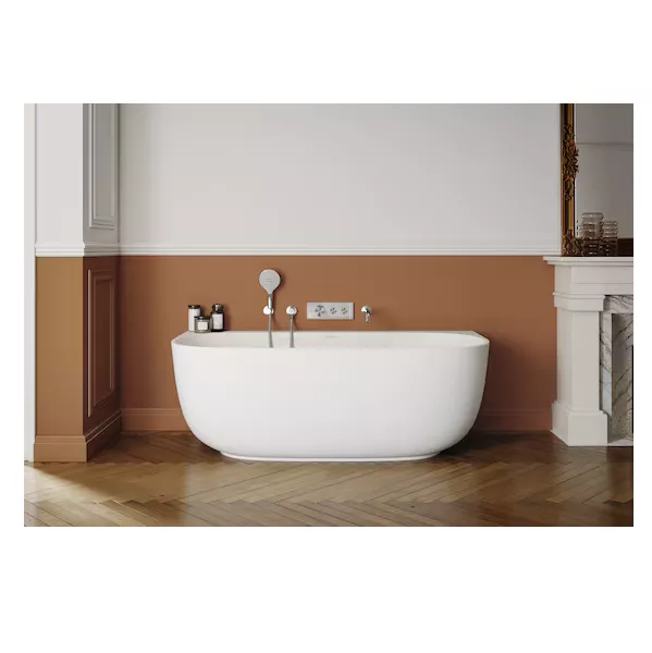 Une baignoire semi-îlot, majestueuse, avec des angles à 90° pour une intégration contre un mur ou dans un angle ( disponible en version îlot pour une installation centrale, voir article similaire en bas de la page).