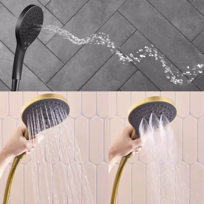 3 jets avec boutons de sélection : jet pluie, jet massant et jet brume.