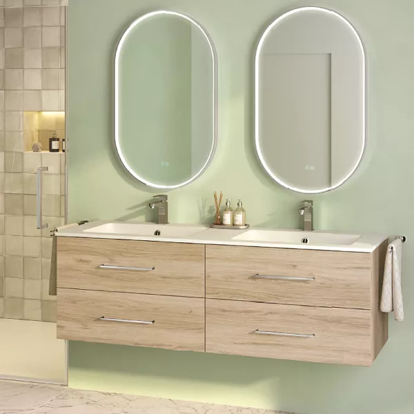 Le prix inclut le meuble 4 tiroirs (finition mélaminé décor bois) & le plan double vasque en Céramyl® (mitigeurs & bondes non inclus).