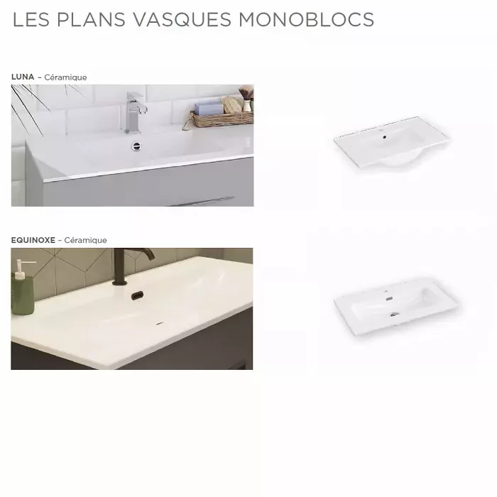 Dimensions : L60, L80 (simple vasque), L100, L120 et L150 cm (simple ou double vasque)