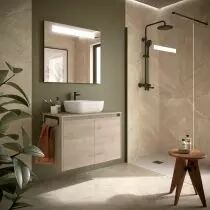 L’ensemble est composé d’un meuble et d'un plan de toilette assorti (vasque, miroir, porte-serviette & mitigeur en option)