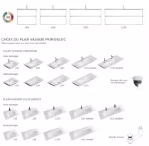 Disponible avec plan-vasque monobloc ou plan compact haute densité laqué verni déperlant ou décor bois pour vasque à poser.