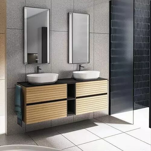 Le prix inclut le meuble 4 tiroirs + niche ouverte & le plan compact 181cm laqué noir mat (vasques, mitigeurs, bondes, porte-serviettes & miroirs en option).