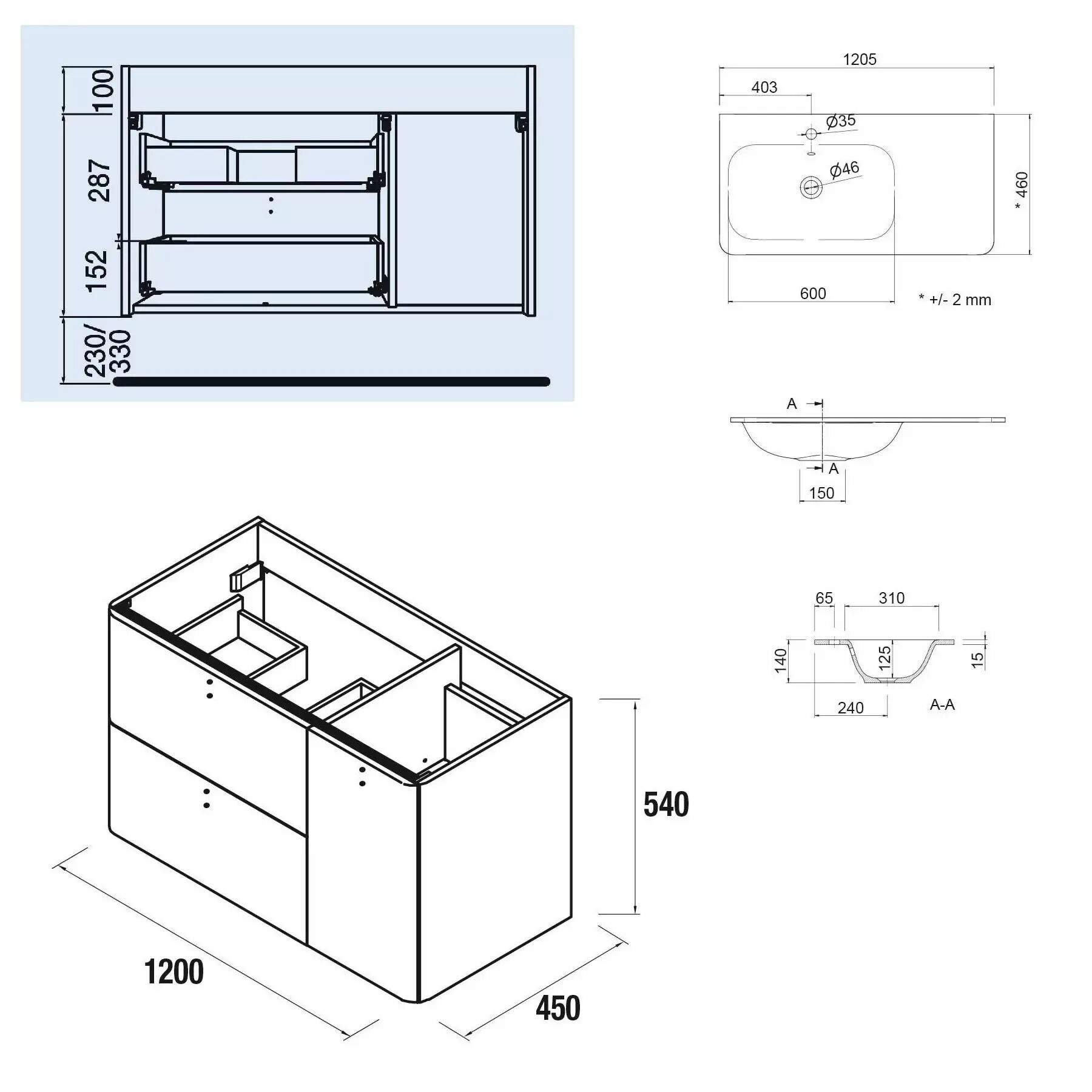 Meuble 120 cm, 2 tiroirs + 1 porte à droite (vasque à gauche)