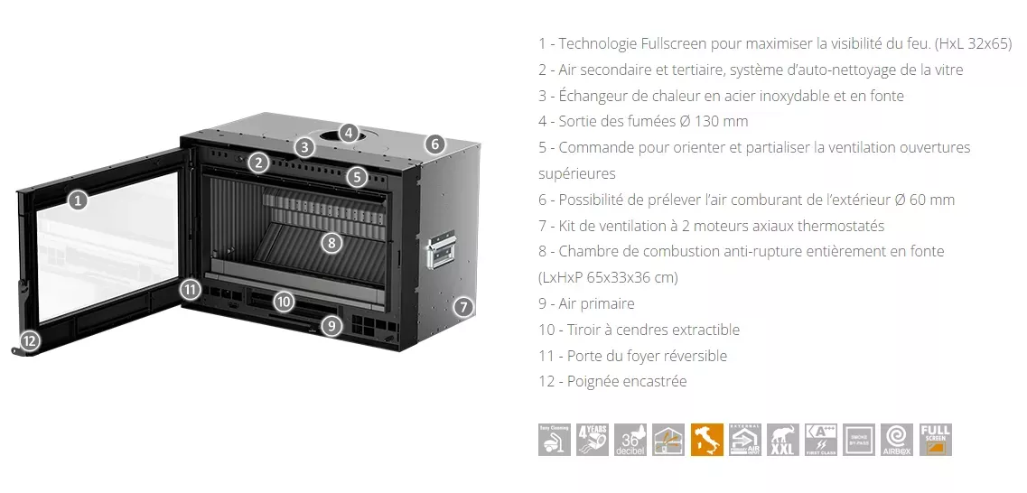 Cheminée à bois 7 étoiles à haut rendement, dotée de la technologie Fullscreen pour maximiser la vision du feu.