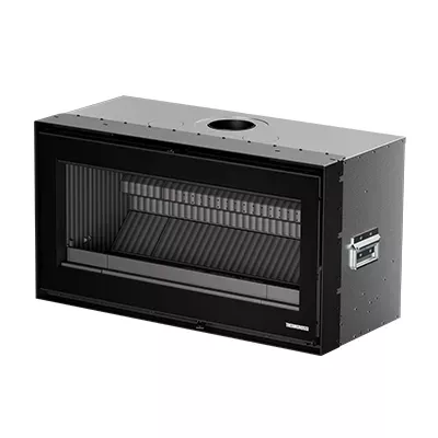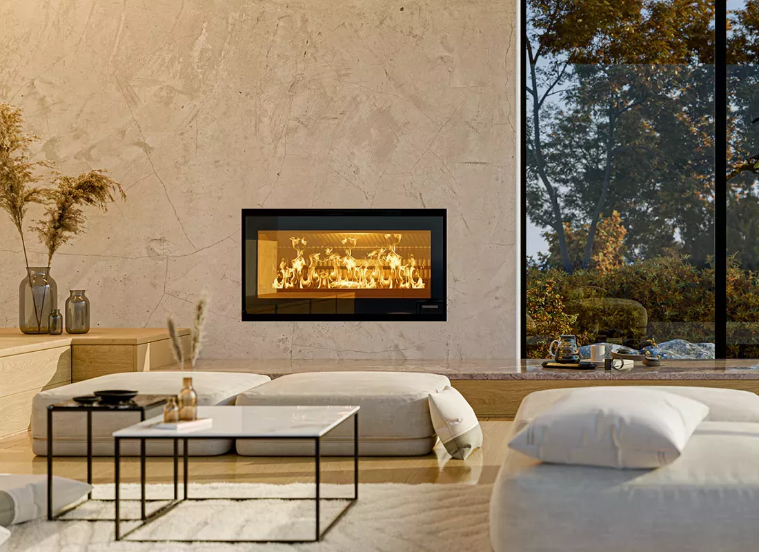 Cheminée à bois 7 étoiles à haut rendement, dotée de la technologie Fullscreen pour maximiser la vision du feu.