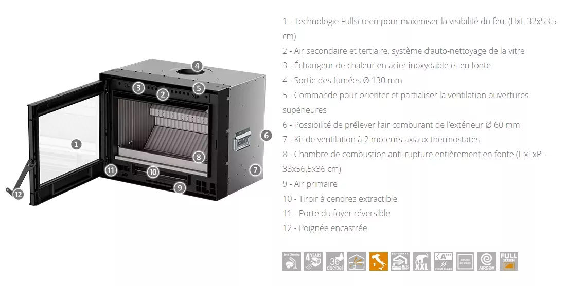 Insert à bois à haut rendement, doté de la technologie Fullscreen pour maximiser la vision du feu.