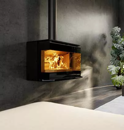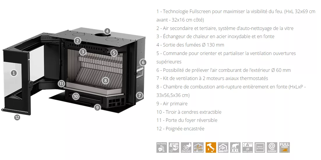 Equilibre parfait entre l’insert et la cheminée à bois, il offre tous les avantages économiques de l’insert, sans renoncer au charme du feu panoramique de la cheminée.