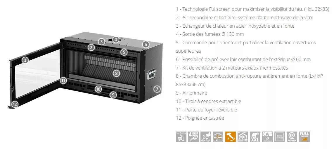 Cheminée à bois 7 étoiles à haut rendement, dotée de la technologie Fullscreen pour maximiser la vision du feu.