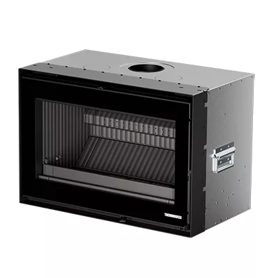 Technologie Smoke by Pass : automatiquement à l’ouverture de la porte, le by-Pass s’active pour éviter que la fumée ne s’échappe dans la pièce, le mécanisme pivote de 90° et libère les imbrûlés déposés dans le passage des fumées, en les faisant tomber dans le tiroir à cendres. Grâce à ce dispositif, l’échangeur de chaleur est toujours efficient, avec un rendement constant de plus de 85%. Le Smoke by Pass permet un nettoyage simplifié à la fin de la saison, sans devoir démonter la chambre de combustion, et une inspection aisée du conduit de fumée.