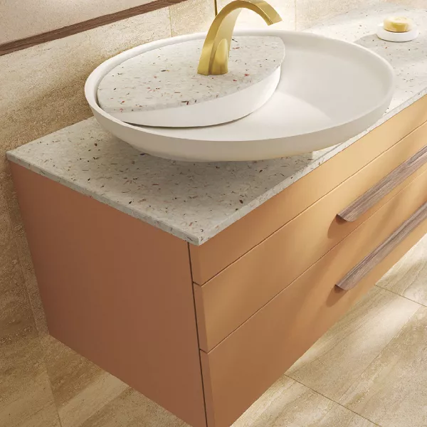 Vasque Ø60 cm en Solidsurface blanc mat et dessus en coquilles Saint Jacques,