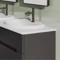 Plan double vasque monobloc en solidsurface avec vasques moulées ou plan décor Céram marbre avec vasques semi-encastrées blanc polaire ou laquée extérieure (assortie au meuble)