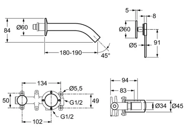 Mitigeur mécanique mural encastré avec poignée baguette.