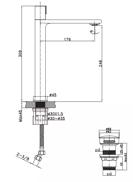 Livré avec bonde clic-clac sans trop-plein (coordonnée au mitigeur)