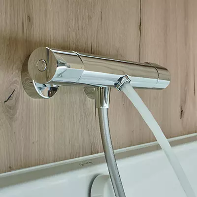 Recommandation : l’installation murale est recommandée pour une largeur de plage de la baignoire jusqu’à 105 mm ; Au-delà, installez-le sur gorge avec des colonnettes (à commander réf. E75456-CP).