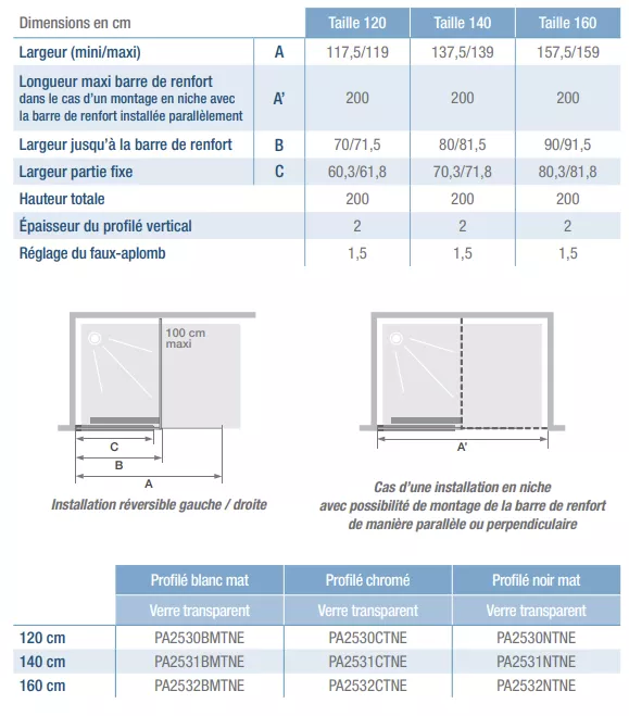 Cette paroi convient aussi bien aux douches en angle ou en niche.