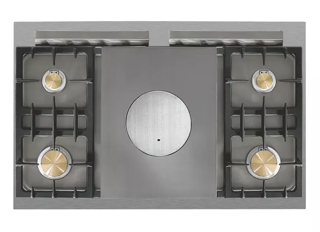 Dessus gaz tradition : 1 plaque coup de feu sur brûleur 5kW, 2x 3kW, 1x 1.5kW, 1x 4kW