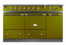 Le piano de cuisson Cluny 1400 permet d'associer aux cinq foyers et deux fours, une armoire neutre ou basse température ainsi qu'une fonction de table de cuisson (feux vifs, foyers électriques, cuiseur vapeur, friteuse, plancha ou gril).