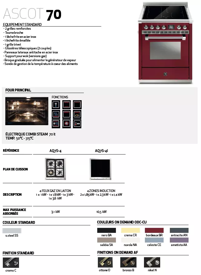 Le câble de branchement électrique n'est pas fourni avec les pianos de cuisson qui disposent d'un bornier de raccordement à l'arrière (prévoir un câble standard de section de 2,5 à 6 mm2 en fonction de la puissance).