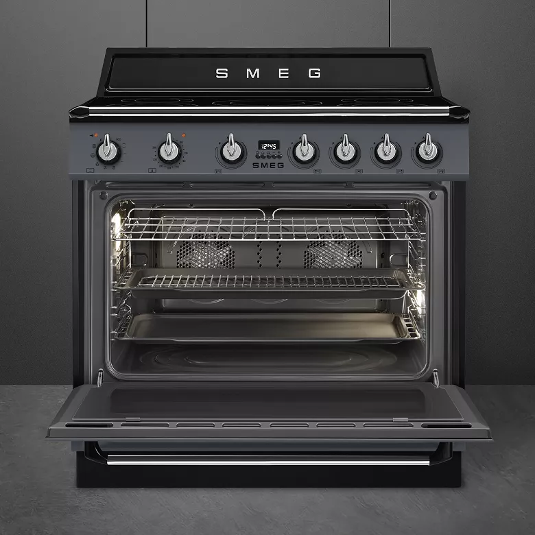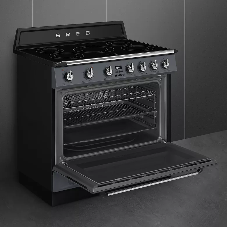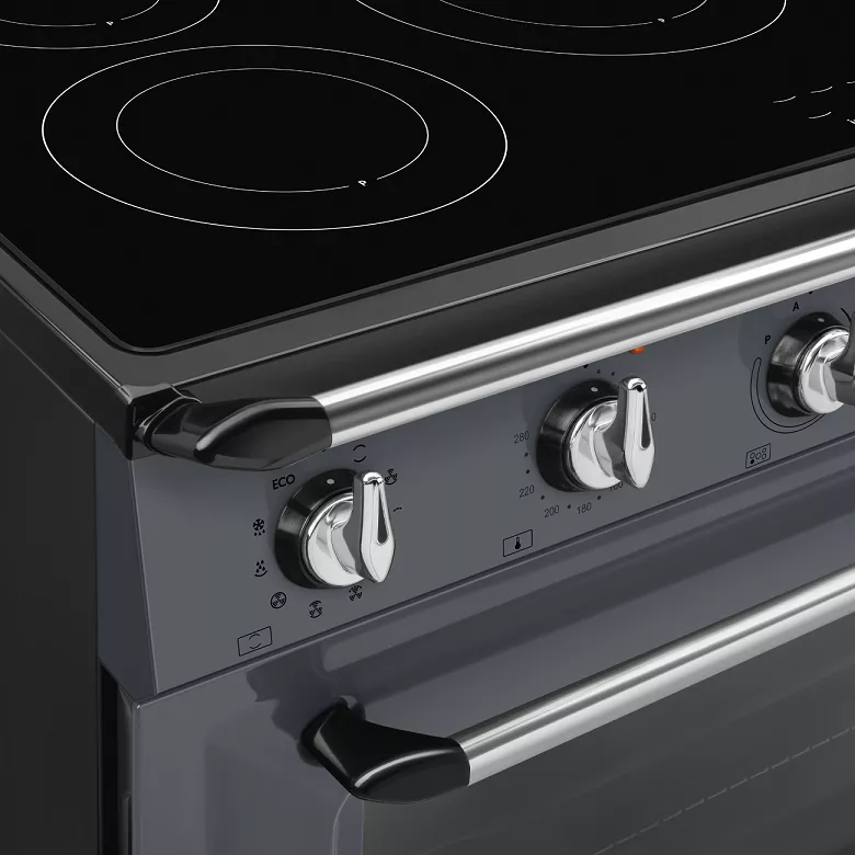 Four électrique multifonction (11 dont double chaleur tournante et décongélation) - pyrolyse - moufle géant 115 L nets, 126 L bruts - programmateur électronique - gril 2900 W - porte froide à fermeture douce - porte intérieure plein verre démontable - éclairage 2 halogènes - kit de rails téléscopiques à sortie partielle - compartiment de rangement push pull - Classe A