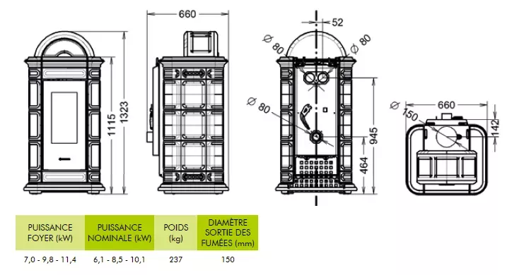 Poêle à bois canalisable avec un rendement de plus de 87,1%