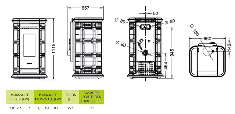 Poêle à bois canalisable avec un rendement de plus de 87,1%