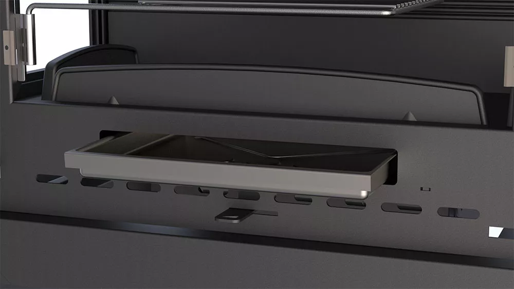 Comprend une grille amovible, rotative et réglable à différentes hauteurs.