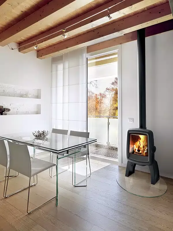 Le système vitre propre permet de ralentir l’encrassement du vitrage. Une arrivée d’air sur le haut de la vitre crée un voile de protection. L’ air préchauffé est propulsé le long du vitrage. Il déclenche la combustion des gaz et des matières volatiles protégeant ainsi la vitre contre la fumée et le dépôt de suie.