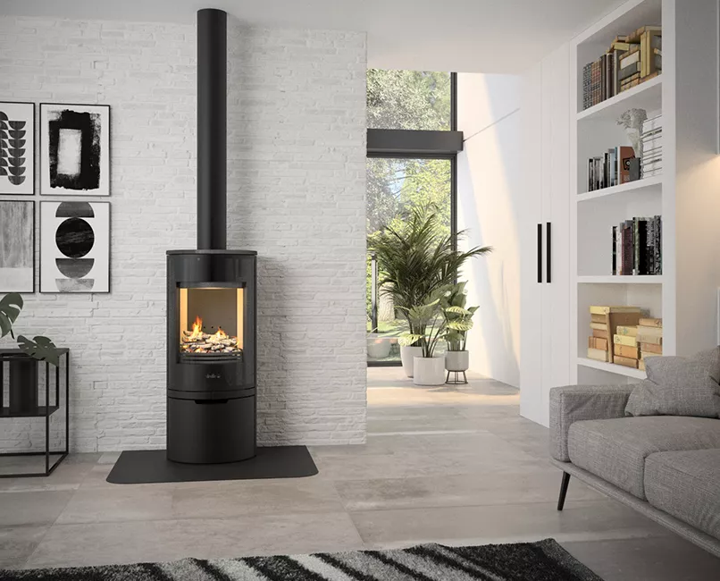 Vitre sérigraphiée positionnée à l’extérieur de la porte offrant un style moderne et une belle vision des flammes.