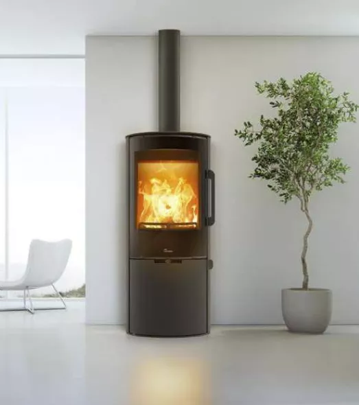 Poêle à bois vertical en acier avec porte en fonte ou verre sérigraphié et forme circulaire.
