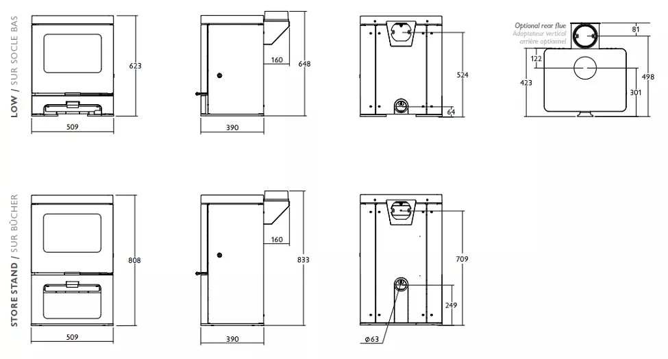 Distance minimale aux matériaux combustibles 300mm/200mm* Côté - 270mm/90mm* Arrière (*avec le déflecteur thermique optionnel)