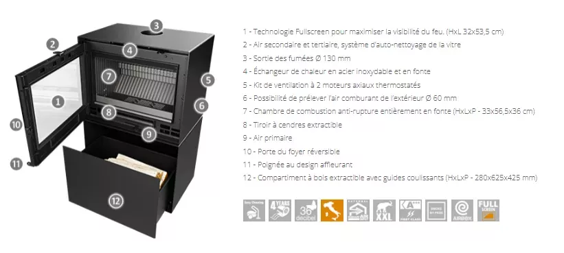 Équilibre parfait entre un poêle et une cheminée à bois à 7 étoiles, il offre tous les avantages économiques d’un poêle, sans renoncer au charme d’un feu de cheminée.