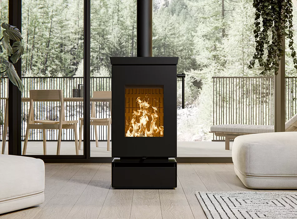Poêle à bois peu encombrant et à faibles émissions, avec un rendement de plus de 85%.