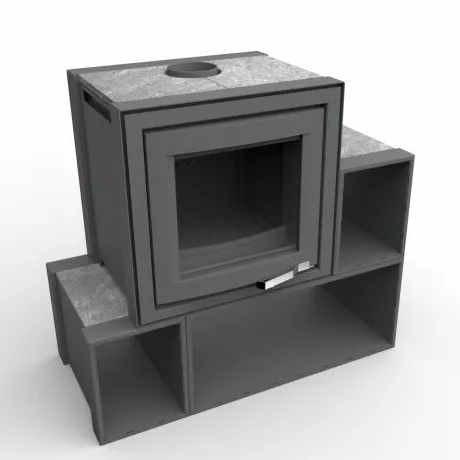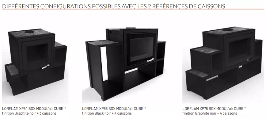 Cet appareil se compose d'un foyer fonte XP54, d'un carter et de deux caissons (en option) : un petit et un grand. Disposés à la verticale ou à l'horizontale, ces caissons confèrent à la gamme des possibilités de personnalisation nombreuses et pratiques pour le rangement du bois.