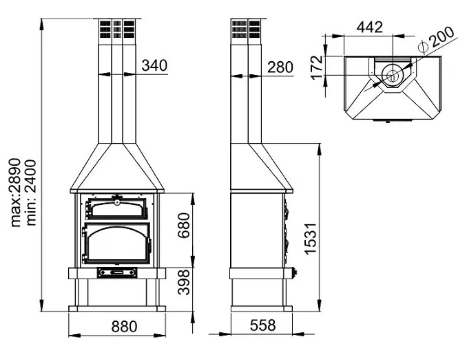 Dimensions : L 880 x H 2400 à 2890 x P 558 mm