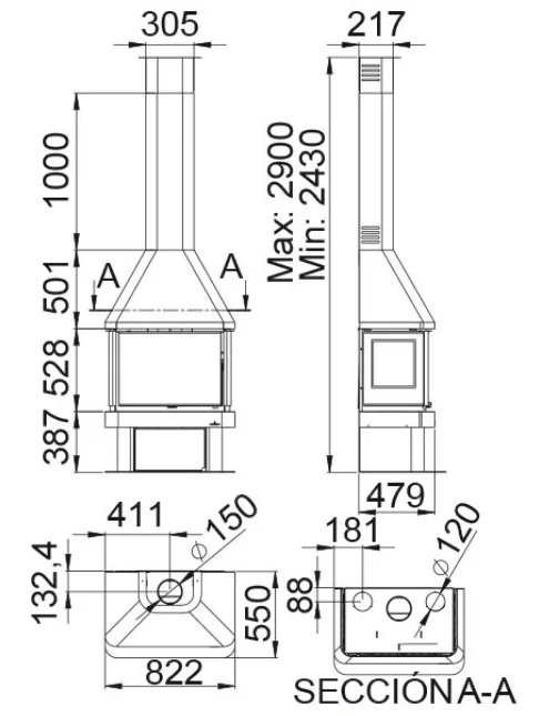 Dimensions du foyer : L 580 x H 306 x P 286 mm