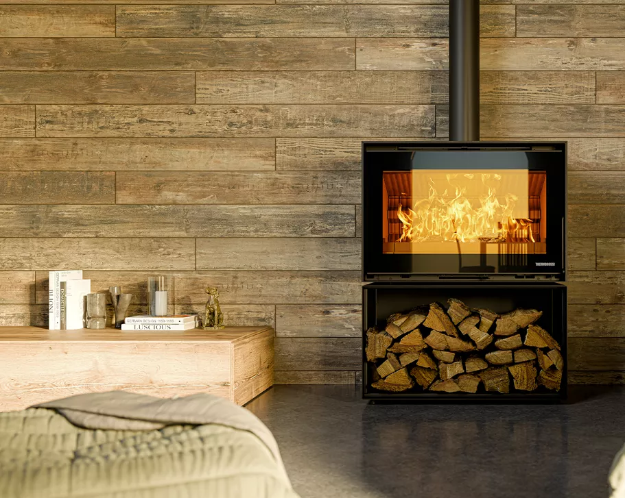Poêle-cheminée à bois suspendue à 7 étoiles à haut rendement, doté de la technologie Fullscreen pour maximiser la vision du feu.