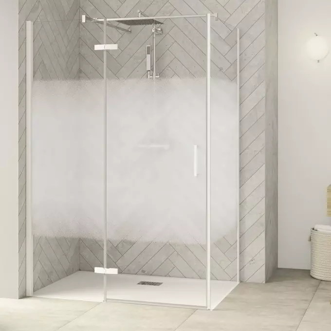 La porte est prolongée avec une partie fixe pour plus de robustesse et permettant ainsi d'installer un meuble vasque à côté de la douche sans gêner l'ouverture de la porte.