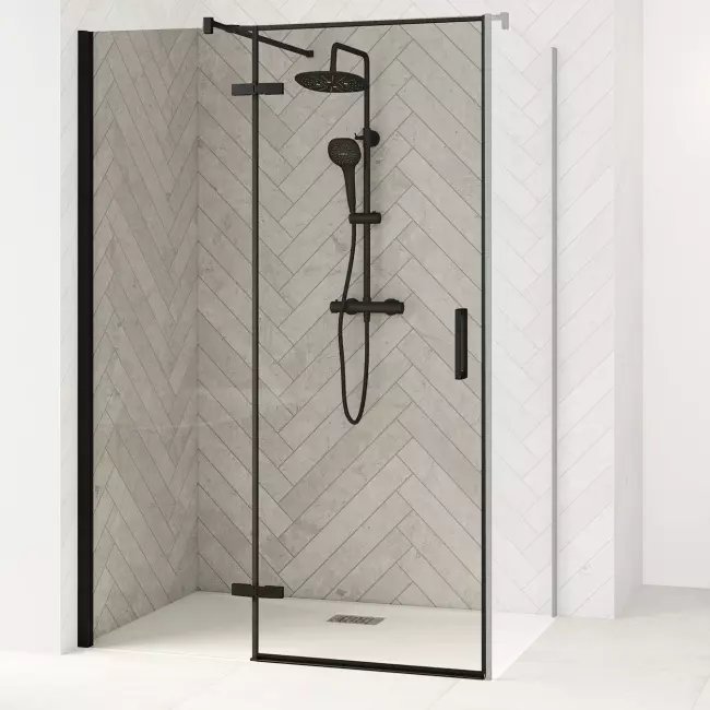 La porte est prolongée avec une partie fixe pour plus de robustesse et permettant ainsi d'installer un meuble vasque à côté de la douche sans gêner l'ouverture de la porte.