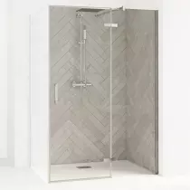 La porte est prolongée avec une partie fixe pour plus de robustesse et permettant ainsi d'installer un meuble vasque à côté de la douche sans gêner l'ouverture de la porte.