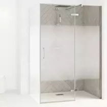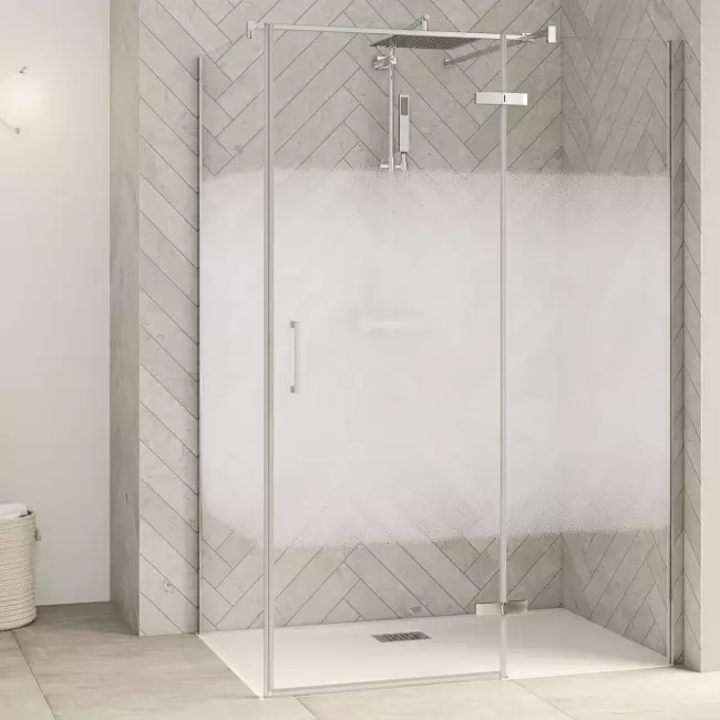La porte est prolongée avec une partie fixe pour plus de robustesse et permettant ainsi d'installer un meuble vasque à côté de la douche sans gêner l'ouverture de la porte.