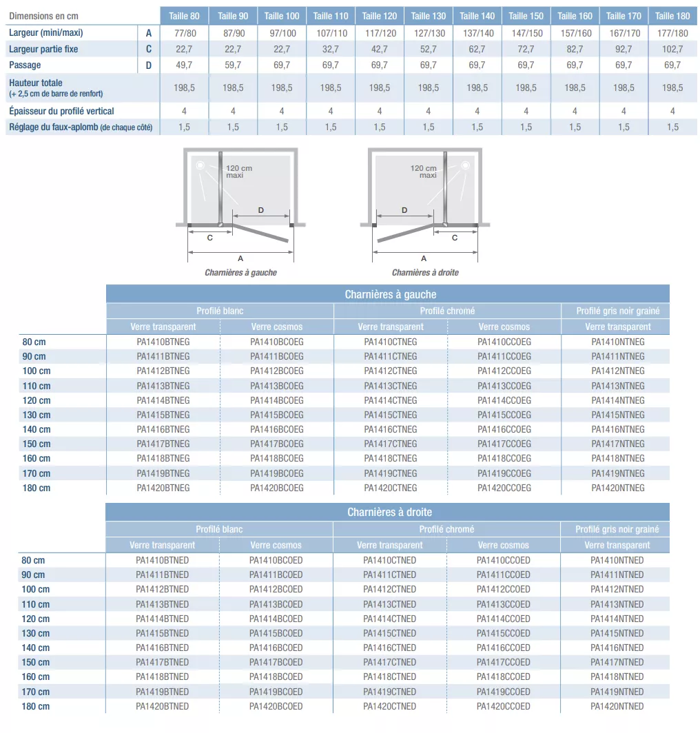 Barre de renfort en inox chromé (pour les parois à profilé blanc ou chromé) ou gris noir grainé (pour les parois à profilé gris noir grainé). 120 cm maxi