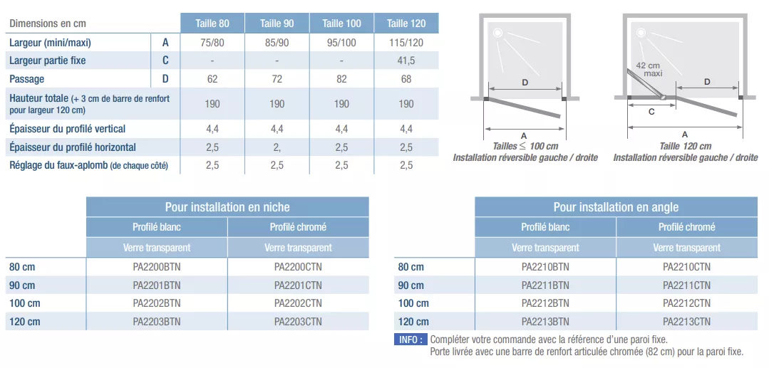 Supra P sans seuil pour installation avec paroi fixe retour PA157...