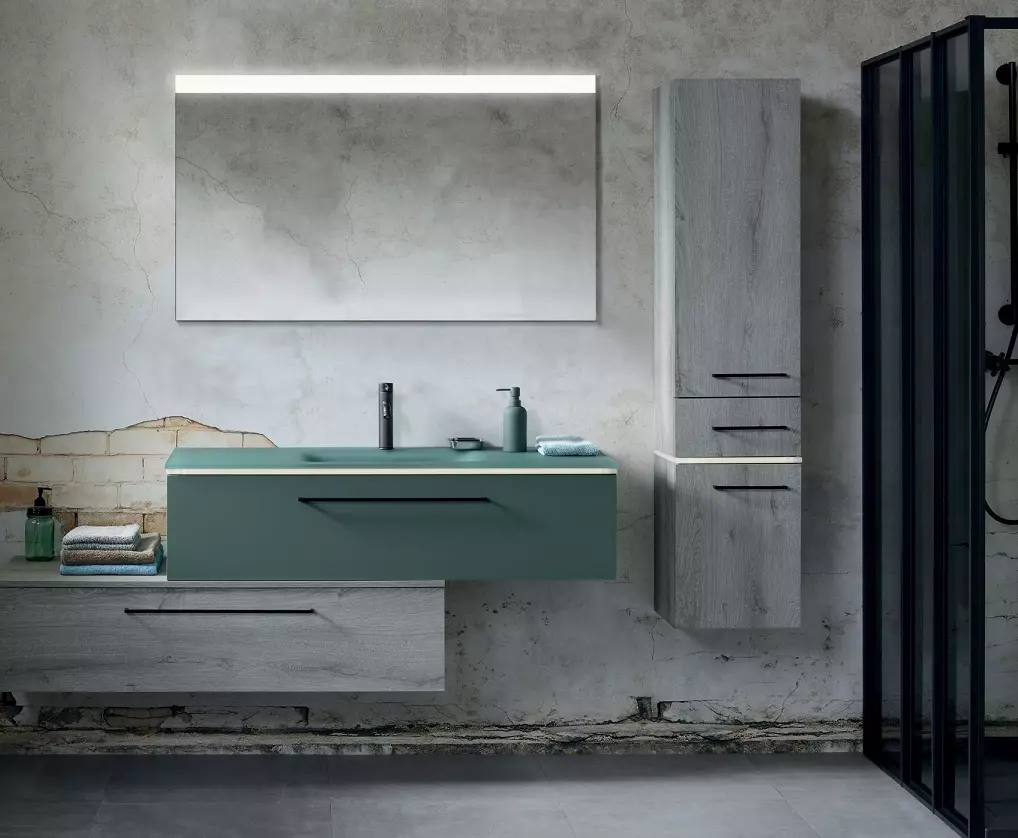 Sous le miroir à droite pour les largeurs de 50 à 110 cm (au centre pour les largeurs de 120 à 180 cm)