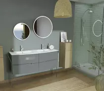 Rétro-éclairage, chemin de LED à l’arrière du sablage périphérique sur miroir (appareil de classe 2 IP 44), 40 W sur ø 50 cm, 52 W sur ø 70 cm et 60 W sur ø 90 cm.