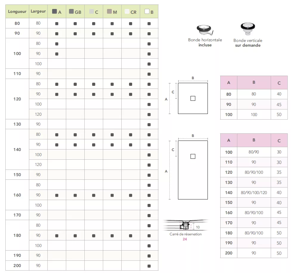 Livré avec bonde horizontale 90 mm à grand débit (Bonde verticale sur demande)