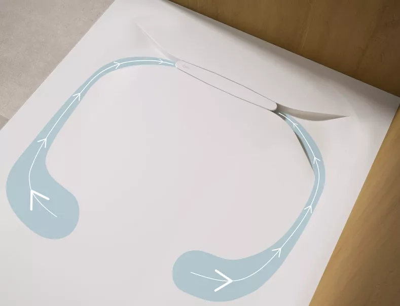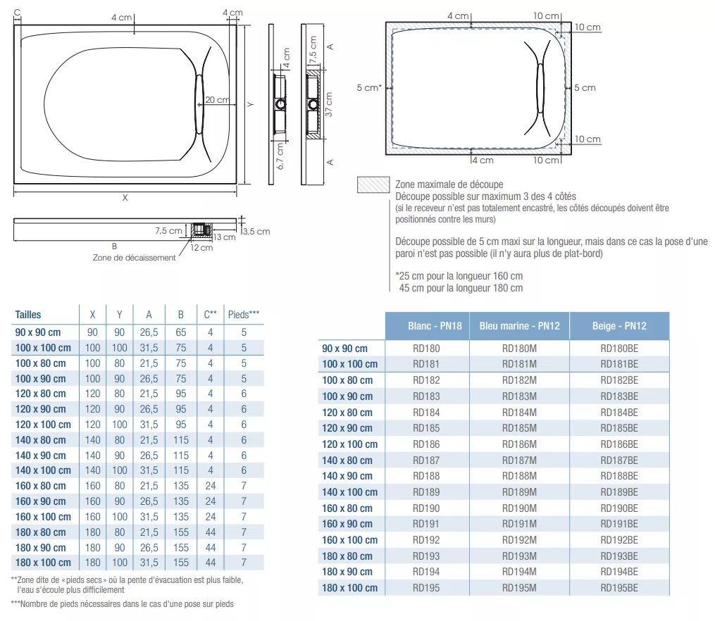 Receveur avec écoulement d'eau latéral inédit, la zone centrale légèrement bombée permet d'éviter d'avoir les pieds dans de l'eau stagnante