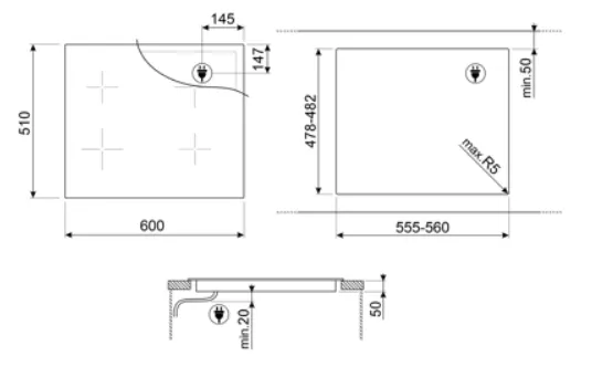 Arrière gauche - Induction - Multizone - 2.10 kW - Booster 2.50 kW - Double booster 3.00 kW - 21.0x19.0 cm