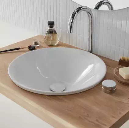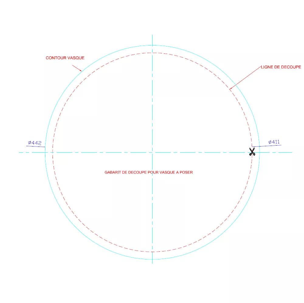 Vasque ronde à encastrer par-dessus.Ø 44,2 cm.Livrée sans bonde.Avec trou de trop-plein à l’avant Sans cache trop-plein